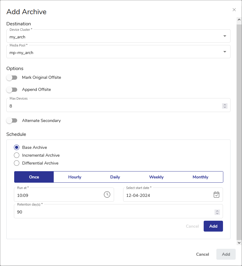 Specify the schedule frequency, start time and date, and Archive retention period. Click Add in the Schedule area. Multiple schedules may be added.