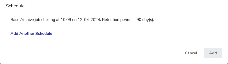The added Archive schedule will be shown in the Schedule area. To add another schedule, click Add Another Schedule.