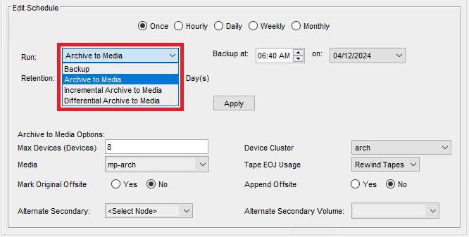 From the Run drop-down list, select the job type you are scheduling. Archive to Media stands for Base Archive.
