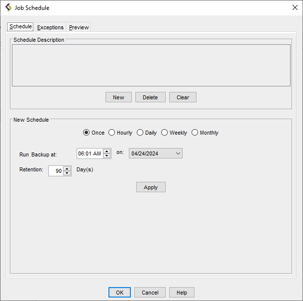 Click the Schedule Job button. This will launch the Job Schedule window. The Schedule Description section lists all schedules defined for the Block backup job. The Edit Schedule section shows the parameters for the description record selected in the Schedule Description section. If no record is selected, the lower section changes its title to New Schedule and the parameters pertain to a new schedule that is not saved yet.