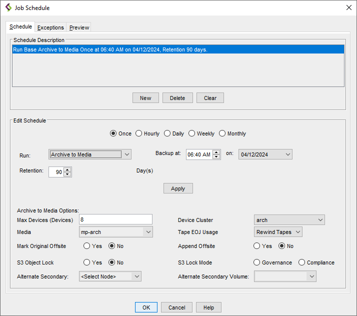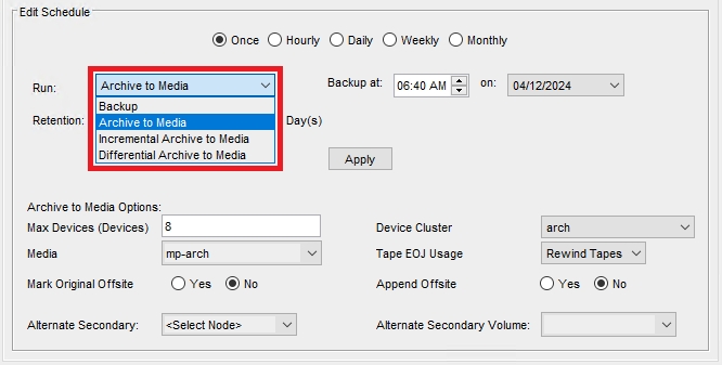 From the Run drop-down list, select the job type you are scheduling. Archive to Media stands for Base Archive.