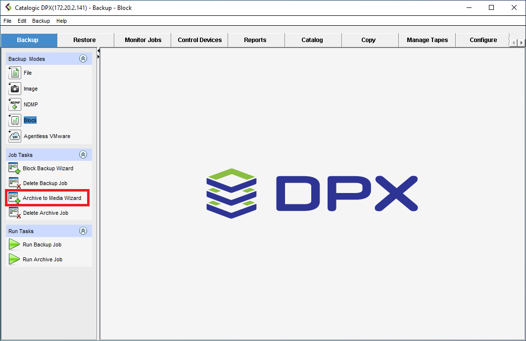 In the desktop interface, archiving is embedded in the Block backup job creation process through the Block Backup Wizard. It can also be accessed through the dedicated Archive to Media Wizard (see the tab to the right).