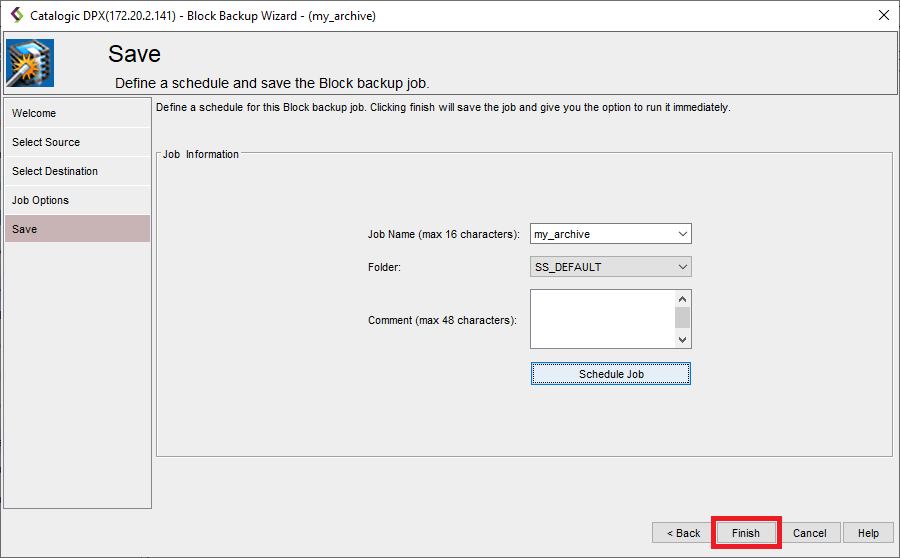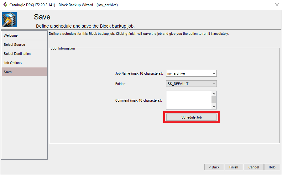 In the Save step, you must enter the Job Name (max. 16 characters) and specify the Job Folder to store the job in (the default folder is SS_DEFAULT). You may also add a comment to the job definition or set up a schedule (See Scheduling a Block Backup).