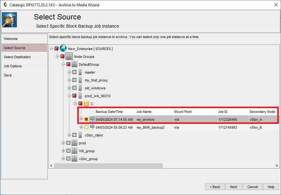 In the Select Source step, choose the Block backup recovery points you want to include in the Archive. Click Next.
