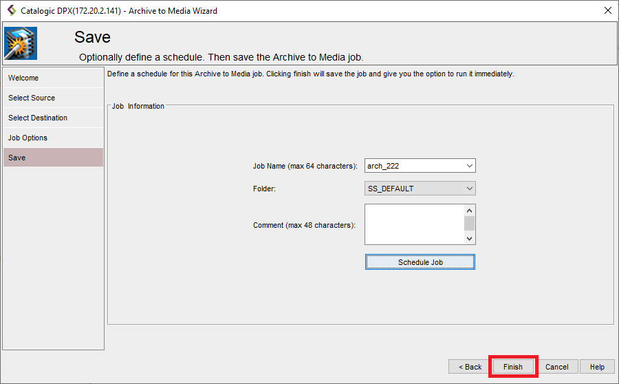 Click Finish to save the Archive job under the same name. If you want to save changes under a new job name, change the name and click Finish.
