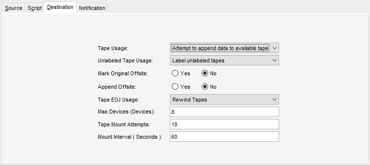 Determines what to do with the tape when the backup job is complete. For selection details, see the Tape EOJ Usage option in Job Destination Options for File Backup.