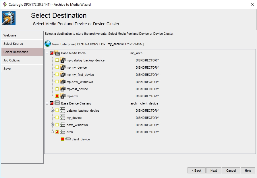 In the Select Destinations step, choose the destination for the archive job. Click Next.