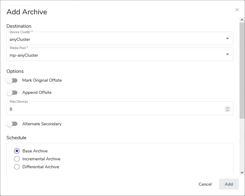 If you want to add an Archive backup to your backup job, click Add Archive in the ARCHIVE pane. The Add Archive dialog will appear.