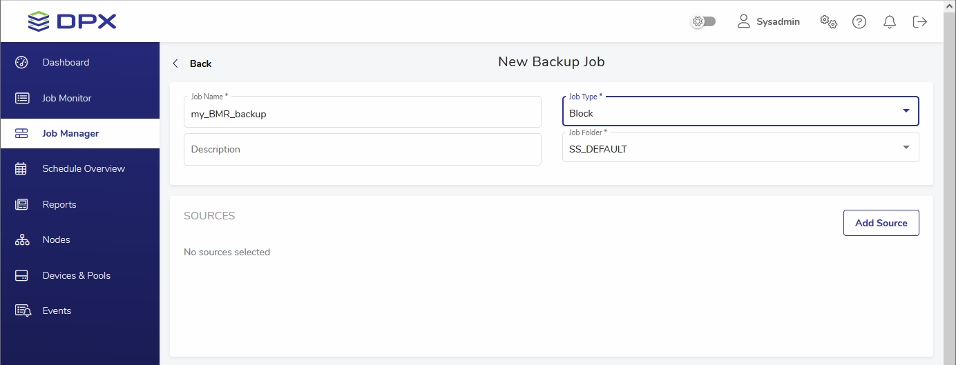 In the main web interface view, go to Job Manager in the sidebar. Then select the New Backup Job button in the upper right corner.