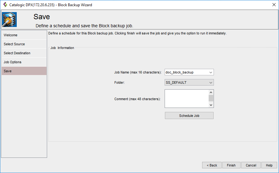 In the final Save step, you must enter the Job Name (max. 16 characters) and specify the Job Folder to store the job in (the default folder is SS_DEFAULT). You may also add a comment to the job definition or set up a schedule (See Scheduling a Block Backup Job).