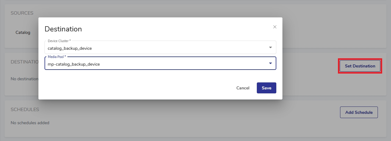 You may also add a schedule in the SCHEDULES pane for the backup to be run on a regular basis. See Scheduling a Catalog Backup Job.