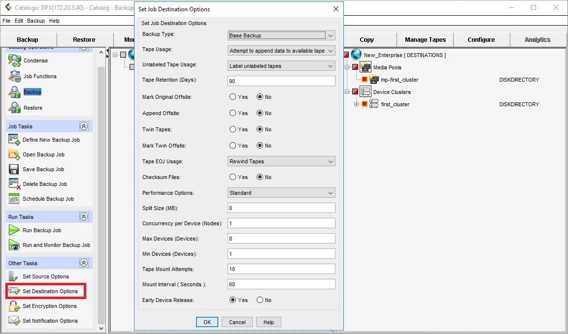 Catalog DPX offers several job options for Catalog backup. All of them are available from both interfaces but the access thereto may differ. See details for each interface below.