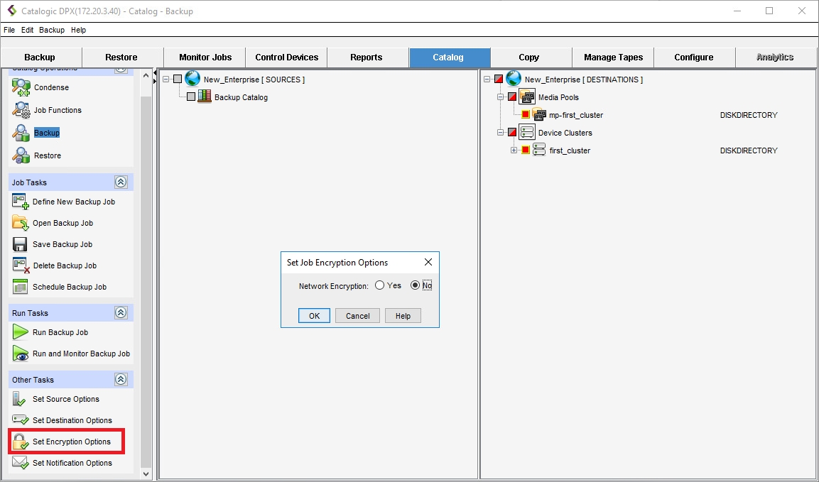 The Set Job Encryption Options dialog controls the encryption of the backup data.