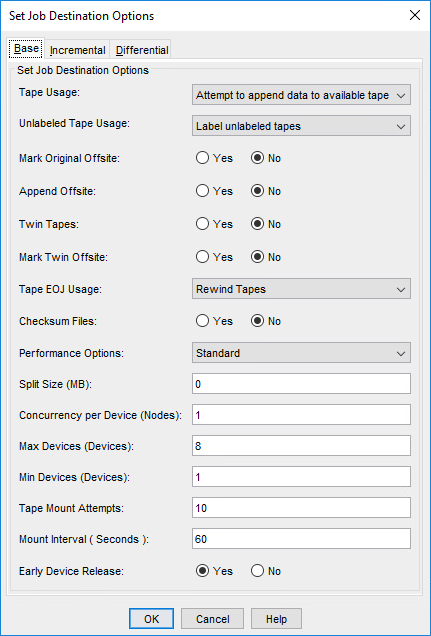 The Set Job Destination Options dialog allows you to set options related to backup destinations. This section provides an explanation of each field in the dialog and the available choices.
