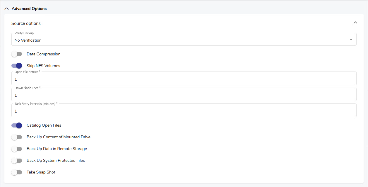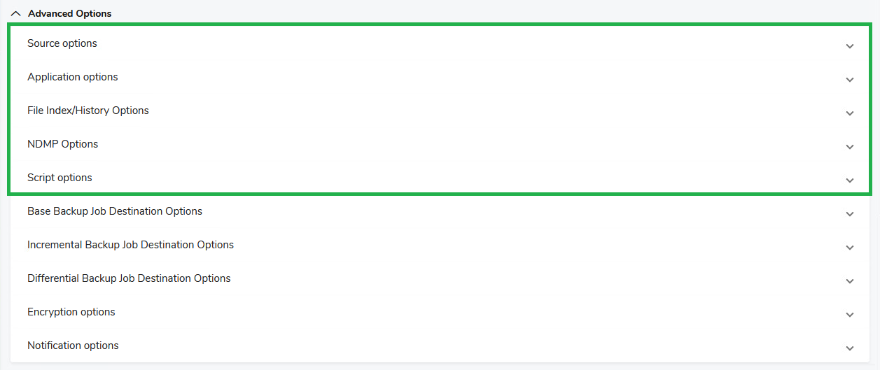 Note. The Advanced Options section in the web interface also includes job destination options which are discussed in a separate section for the sake of clarity. See Job Destination Options for File Backup.