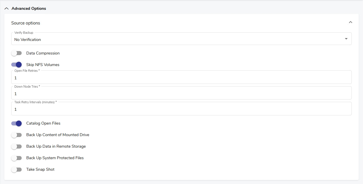 If this option is selected, DPX first creates a snapshot of the current state of all data to be backed up. Then, DPX backs up the snapshot to the destination server. This enables DPX to back up open files.