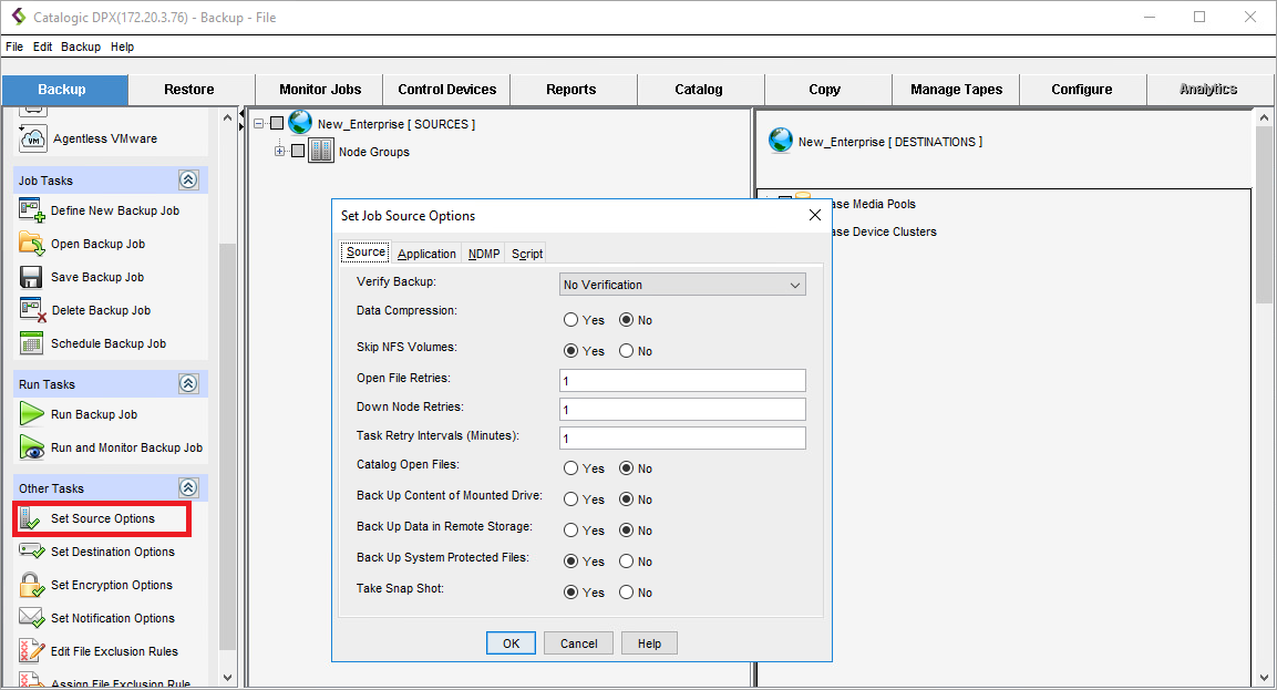 The Set Job Source Options dialog allows you to set options related to backup sources. This section provides an explanation of each field in the dialog and the available choices.