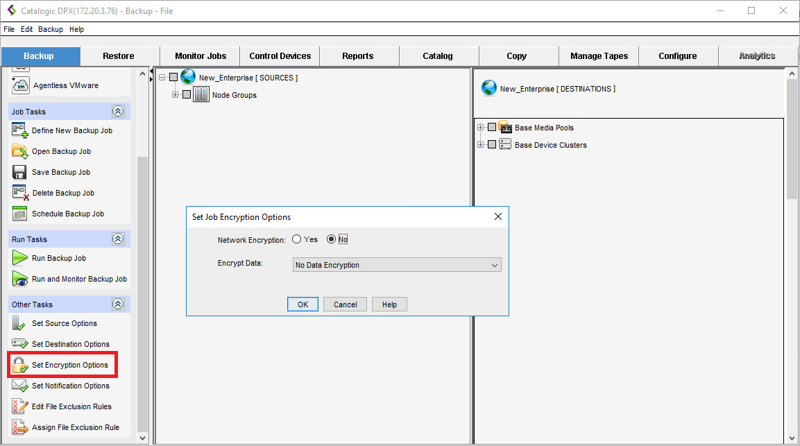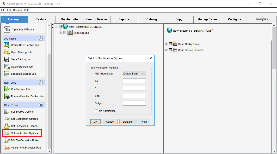 Apart from source and destination options, DPX offers some additional backup job options, such as Job Encryption Options and Job Notification Options. They are available from both interfaces as presented below.