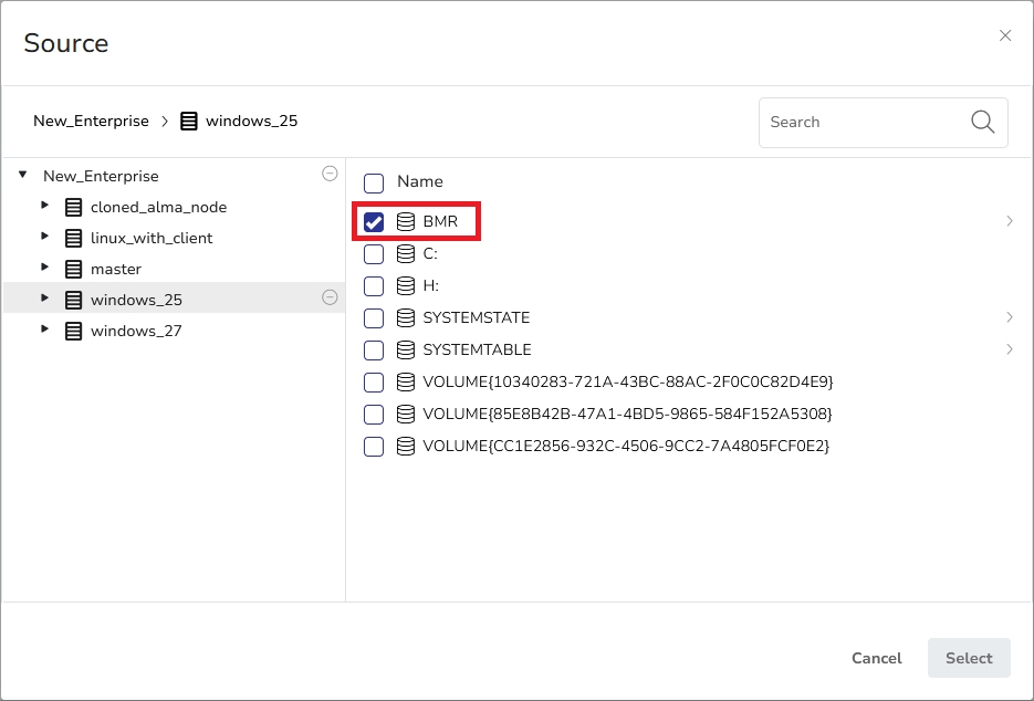 When backing up individual volumes, include the BMR volume in the backup selection. The BMR volume appears with other volumes in the backup source tree on a Block backup window.