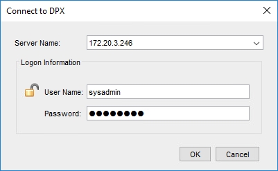 Open the Java file for the Java-based DPX Management Interface from your workstation. In the Connect to DPX dialog, enter the following fields: