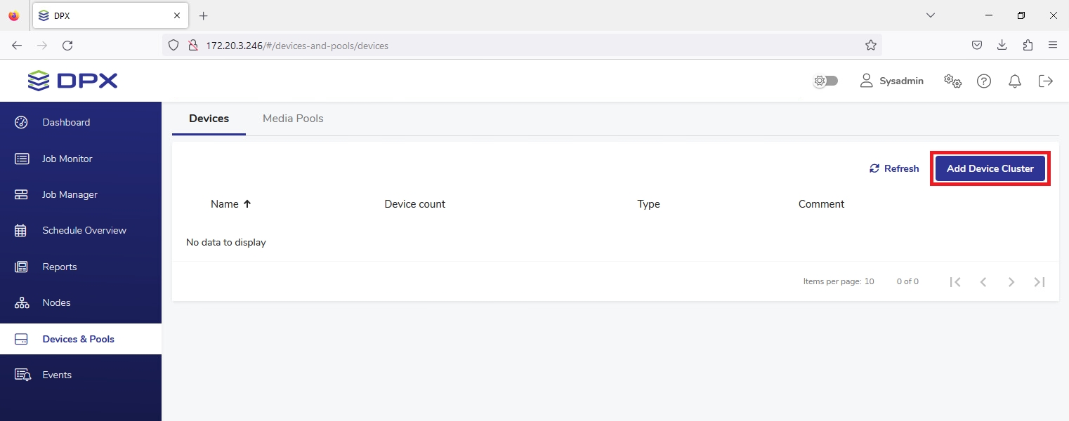 A device cluster is a logical grouping of non-tape library (standalone) backup devices. For information about adding a tape library, see Adding a Tape Library.