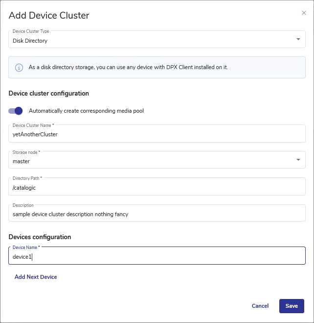 Under Devices configuration, specify at least one name for a new device that will be created with the cluster. Select Add Next Device to add more devices. Click the X symbol to the right of the new Device Name to cancel adding this device.