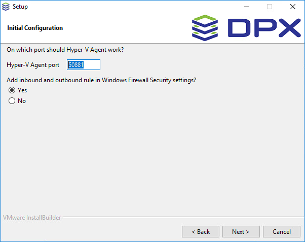--port– port number (default: 50881)--installDir– custom installation directory (default: C:\Program Files\DPX\Hyper-V Agent)--firewallRuleName– custom name for firewall rule added by the installer (default: DPX Hyper-V Agent)