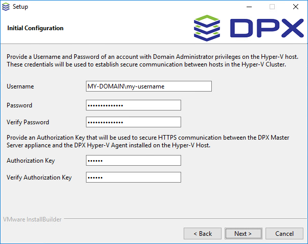 Important. Particular attention must be paid when providing credentials for the Hyper-V host, as the Installation wizard does not verify the credentials. As a result, even though the installation may seem successful, invalid credentials will prevent the DPX Hyper-V Agent service from installing, thus making the Hyper-V host unusable.