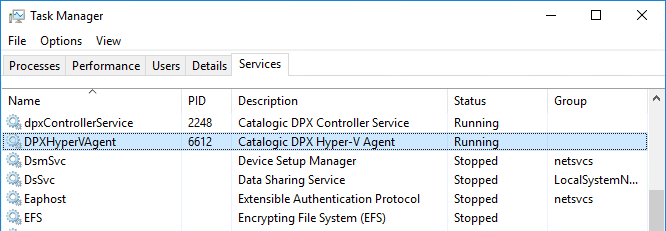 Upon successful installation, the DPX Hyper-V Agent service should be up and running on your Hyper-V host: