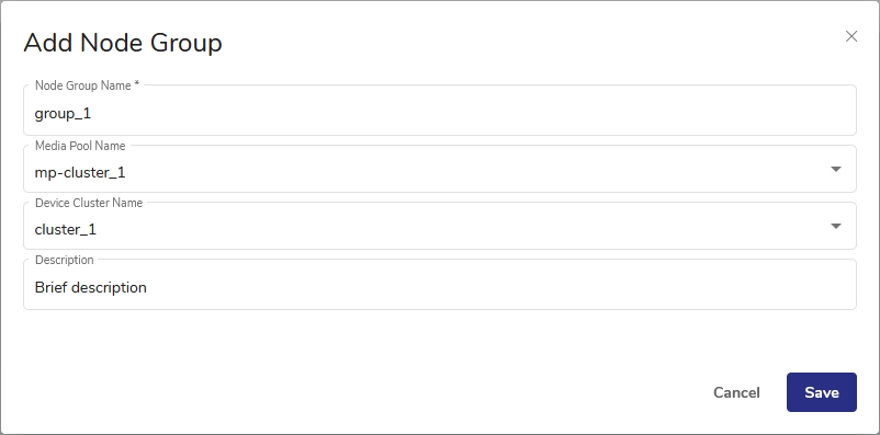 A device cluster is a set of storage devices, such as tape drives. If there are no device clusters or tape libraries in the pull-down menu, you can edit the node group later to add one.