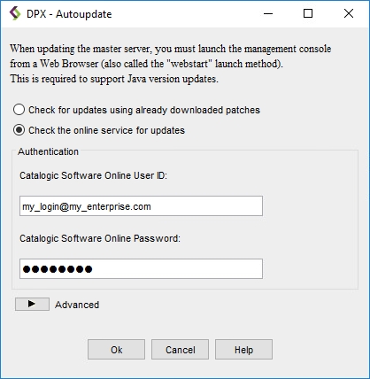 In the Autoupdate dialog, select Check the online service for updates (default). Use this option if the Catalogic DPX Master Server has access to the Internet, and you want to install the latest update packages on the system with fewer steps.