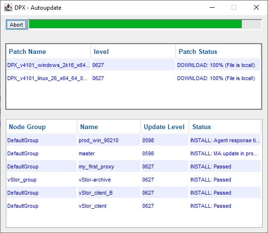 Do not click Abort to stop updating the selected nodes unless absolutely necessary or instructed by Catalogic specialists.