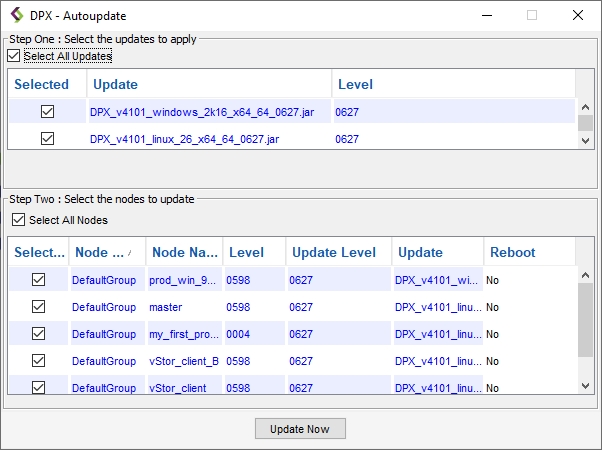 In the Autoupdate dialog, you can see a list of all available software update packages and a list of applicable nodes, including the DPX Master Server, with checkboxes. By default, all nodes are selected to update. You can clear any checkboxes to skip updating the systems. Click Update Now and follow the instructions in the dialog. The top pane lists software update packages found for the Enterprise. The name of the update is listed as well as the level of the update. The bottom pane lists nodes to be updated with the various software update packages selected in the top pane. By default, all packages and nodes are selected for update, indicated by check marks. Select All Updates and Select All Nodes are also initially selected. For initial deployment, accept these defaults.