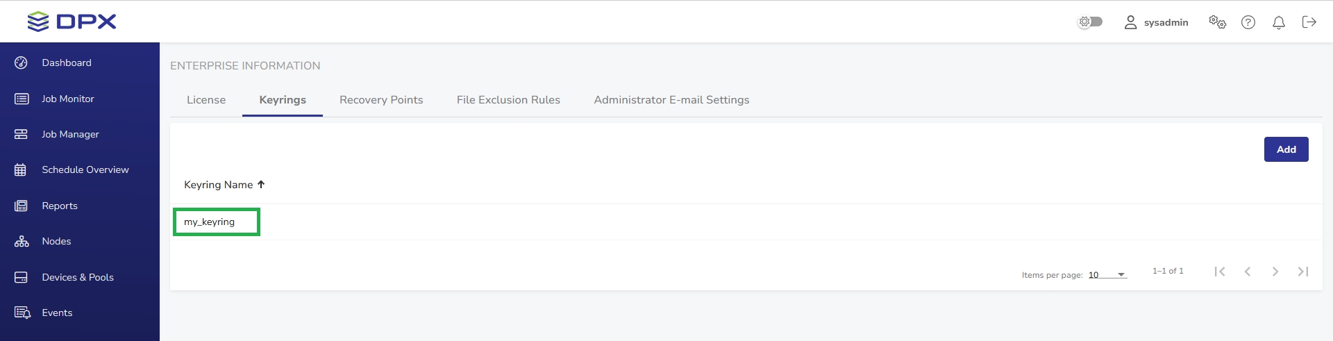 Specify the keyring name. Click Add. The keyring is added to your DPX.