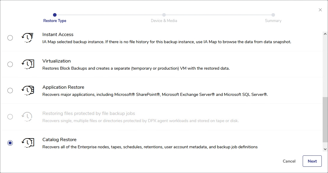 Typically, the Catalog Restore job should be run on a newly deployed DPX Master Server. Restoring the Catalog on a working DPX may result in data loss.
