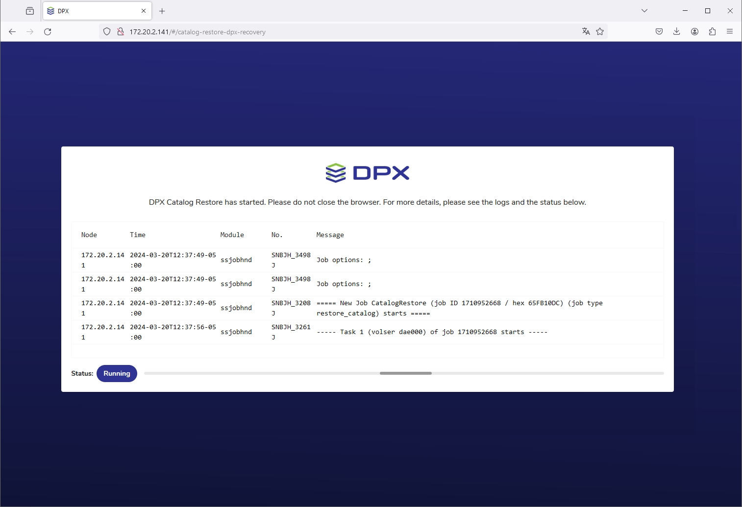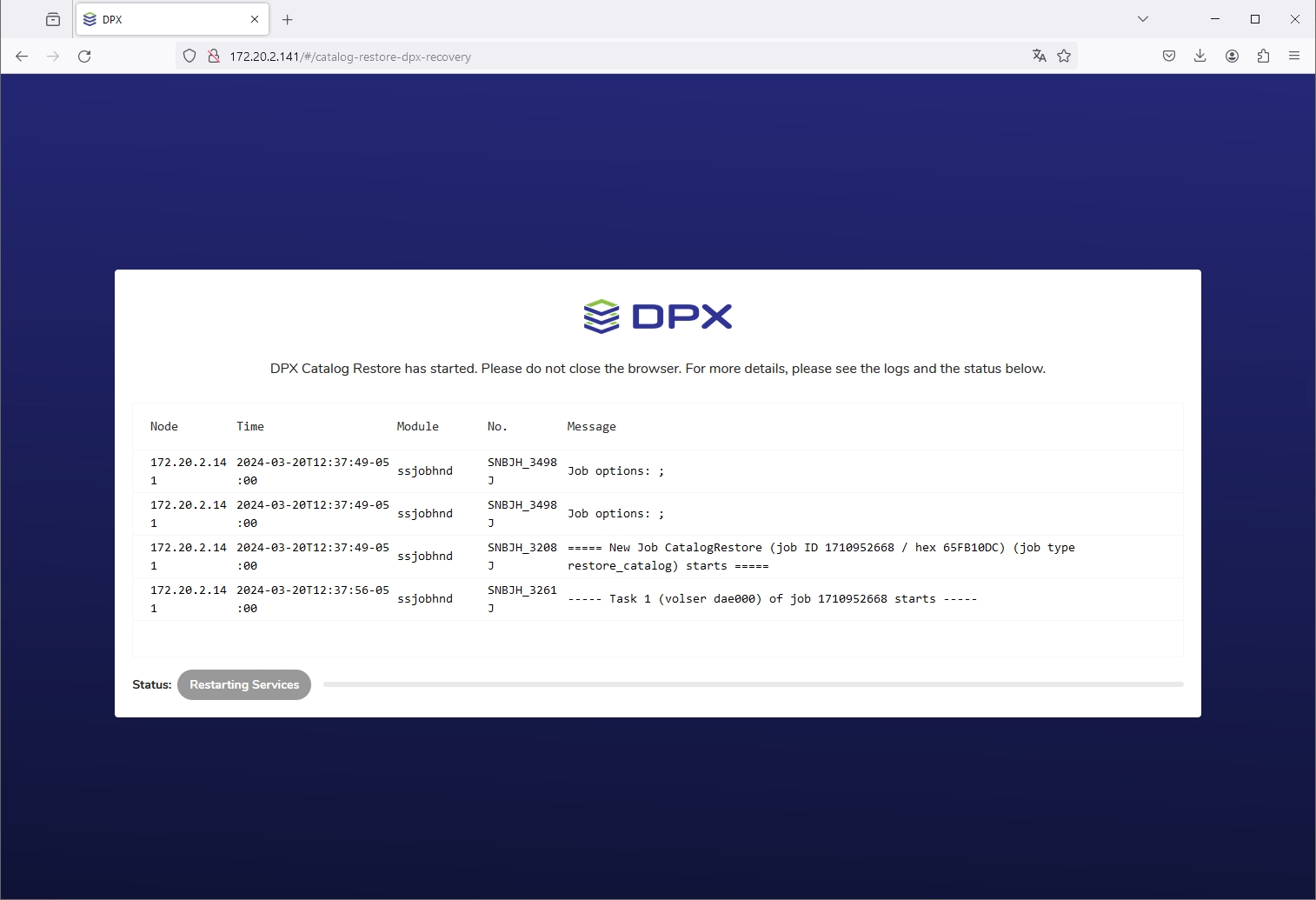Warning! Running the Catalog Restore job will overwrite your entire DPX Master Server. Before running the job, create a fresh snapshot of your DPX Master Server machine in the unlikely case the Catalog Restore fails.