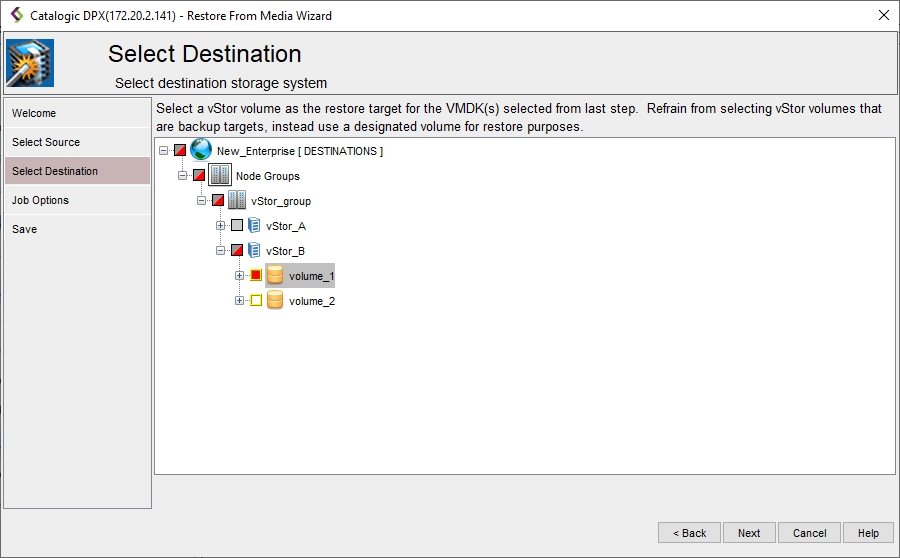 Recovery of an archived agentless backup is done in two steps. In Step 1, you restore the backup instance from media to a vStor volume. In Step 2, you complete the initially intended recovery by restoring your backup instance from vStor.
