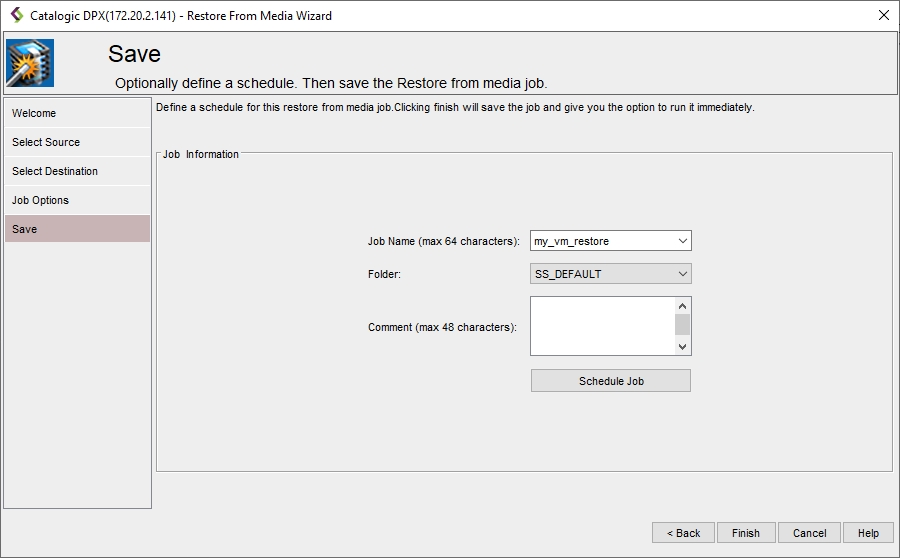 In the Save step, specify the job name enter the Job Name (max. 64 characters) and specify the Job Folder to store the job in (the default folder is SS_DEFAULT). You may also add a comment to the job definition or set up a schedule, by clicking Schedule Job.