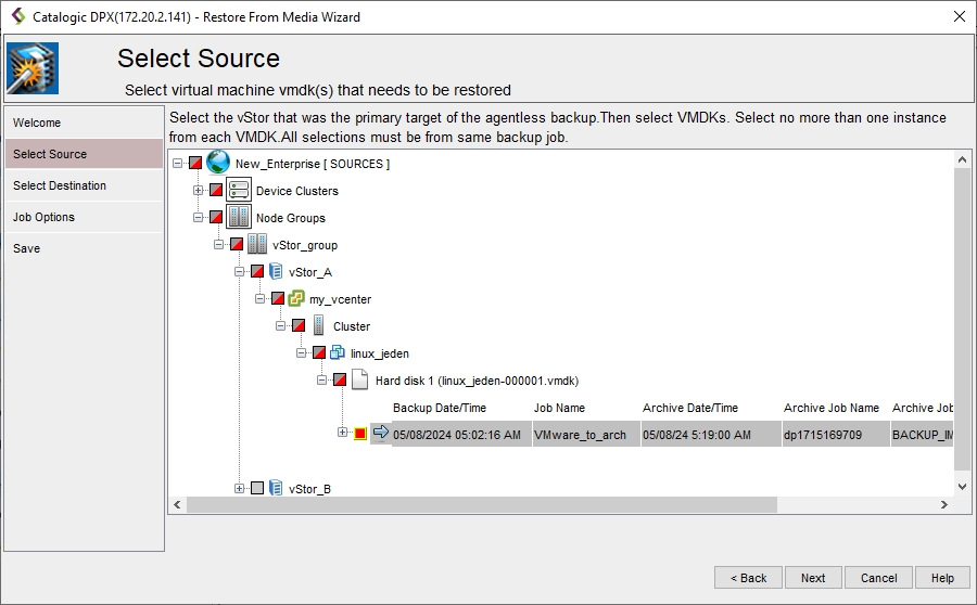 Select the vStor where the VMware backup, the source for Archive, resides. Click Next.