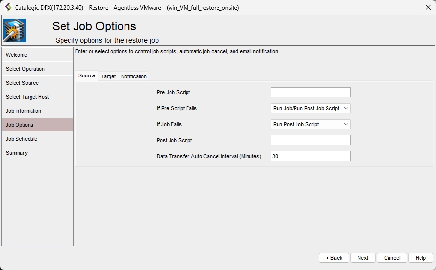 Set up pre-job and post-job scripts, disk provisioning, and notifications. For more detailed information on each available field and tab, see the tables below: