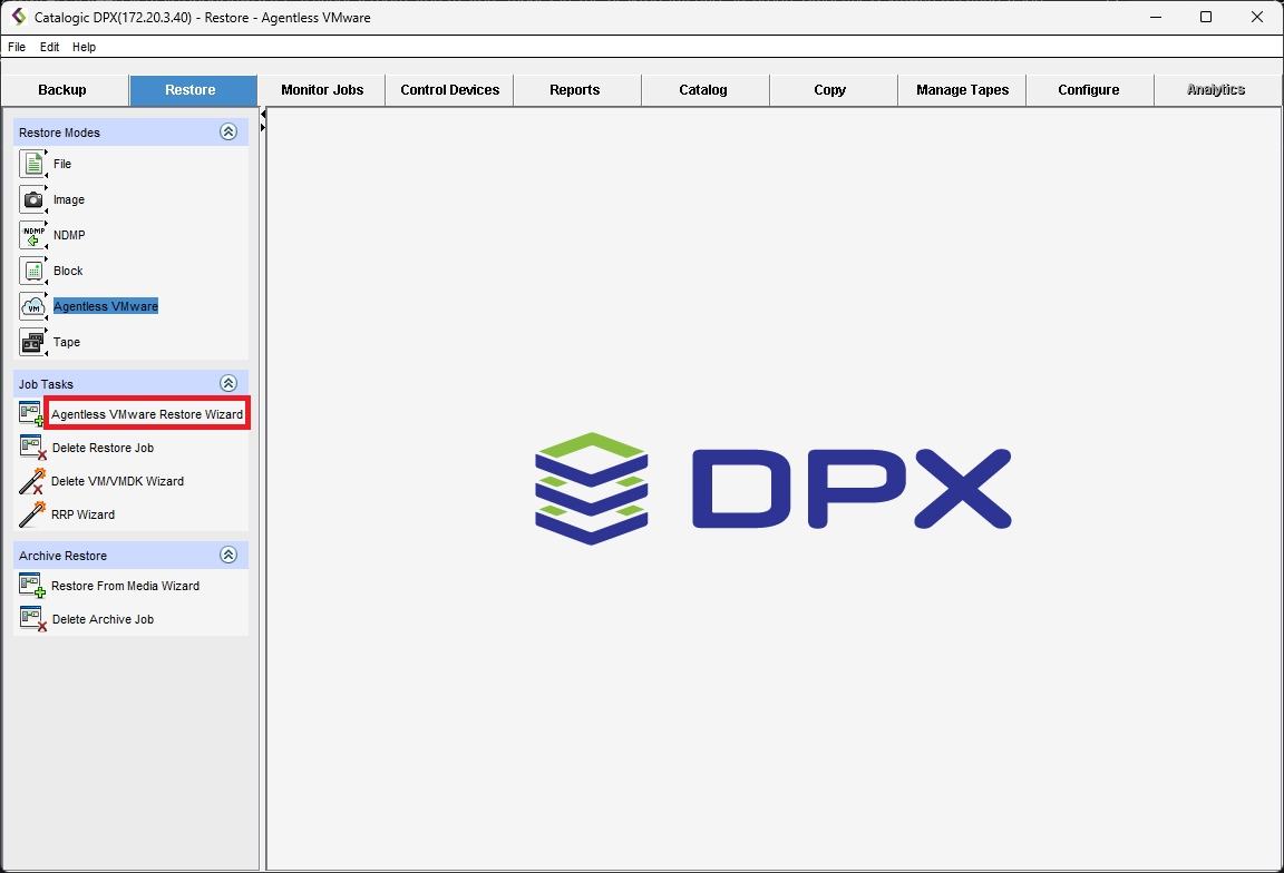 To create a new Agentless VMware Restore Job, select Agentless VMware Restore Wizard.