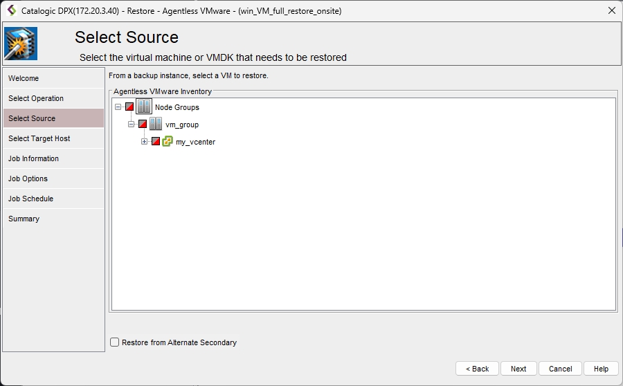 Attention! If the snapshot to restore resides on an alternate secondary storage, such as a storage system at a remote site, use the Alternate Secondary section on the Select Source page to identify the storage. This is crucial in scenarios requiring disaster recovery failover from offsite NetApp SnapMirrored snapshots or vStor replication snapshots. The alternate secondary must be synced with the mirror source.