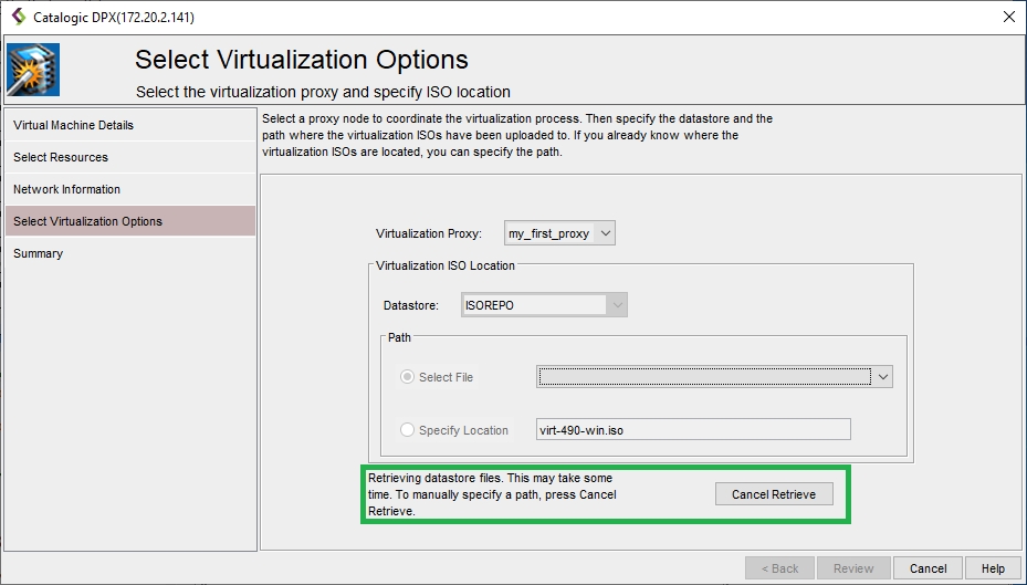 Indicate the Virtual ISO Location. You will need a virtualization ISO of the operating system required for your machine (Linux or Windows). Normally, you will obtain it from the appropriate MySupport DPX Virtualization Support section. If in doubt, contact our Technical Support team. If you want to select a datastore where the ISO is located, you need to wait a moment until DPX retrieves files. If you want to manually specify the ISO location, click Cancel Retrieve and then select the Specify Location radio button.