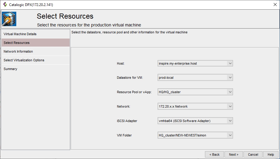 In the Select Resources step, specify the Host, Datastore, Resource Pool/VApp, Network, iSCSI Adapter and the VM Folder where the new VM will be logically located. Click Next.