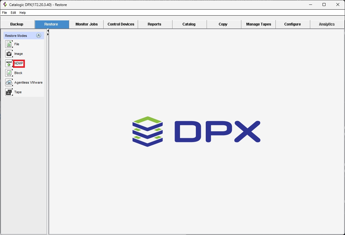 In the main desktop interface window, go to the Restore tab, and from the Restore Modes section in the task panel, choose NDMP.