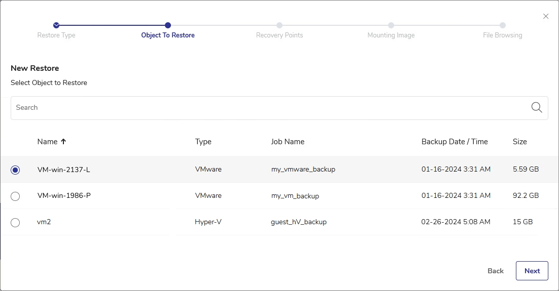 The VM object list shows all VMs you backed up using the DPX Agentless Backup. The available objects to restore can be sorted by Name, Type, associated Job Name, the backup Date/Time, or by Size. Find the VM that contains the files or directories in the VM object list you want to restore. Click Next.