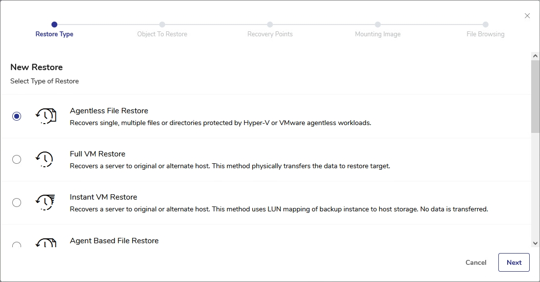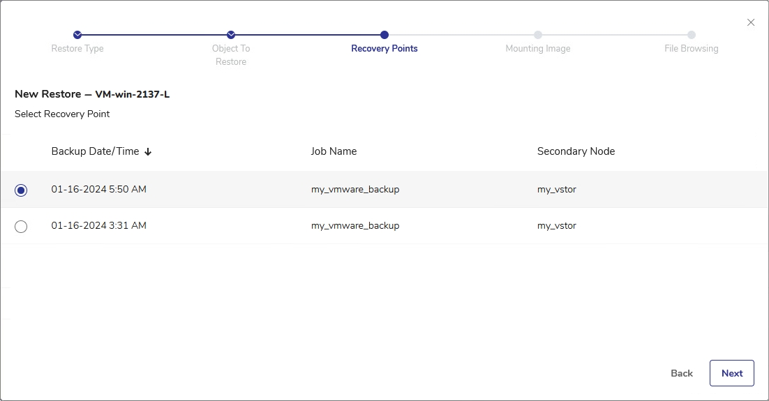 From the list of recovery points of the VM object, select the recovery point that contains the files or directories to restore. Click Next.