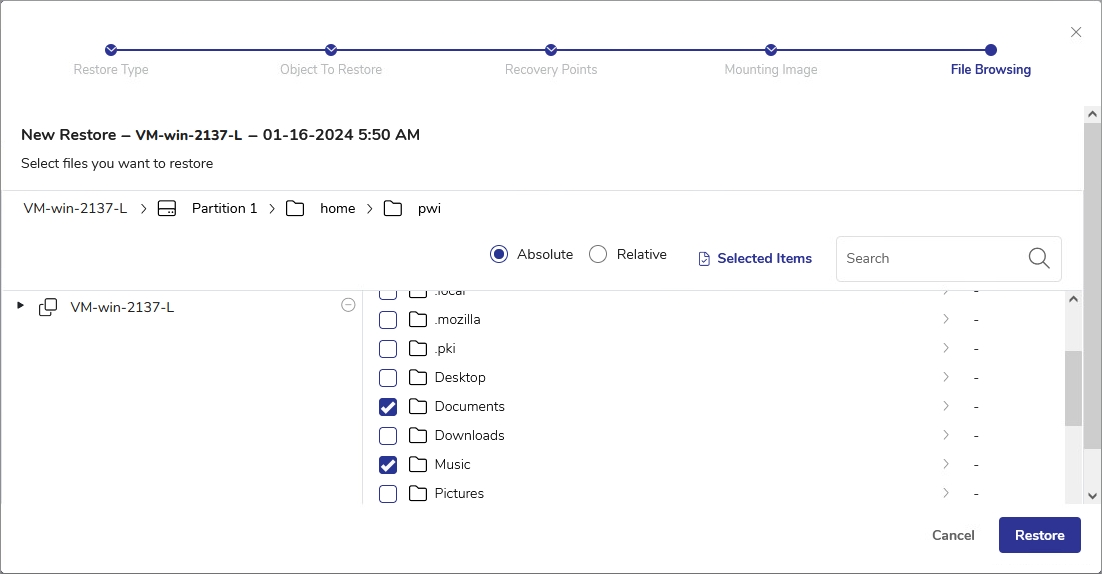 In the File Browsing step, You can browse the partitions in the VM that you selected, as well as directories and child directories in the navigation tree. Select directories or files to restore in the main pane. You can also use the search field to search files or directories in the VM.