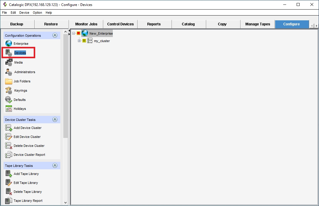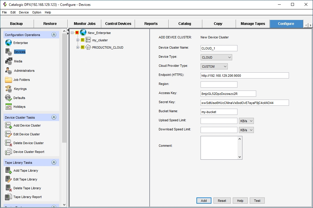 A device cluster is a logical grouping of non-tape library (standalone) backup devices. Catalogic DPX supports the following cloud providers: MinIO, StorageGRID, Cloudian, Wasabi, and Scality RING. Follow these steps to add and configure one of these cloud providers for Agentless VMware backups or Block archiving.