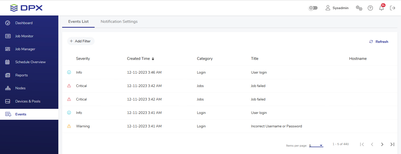 You can control this view by ordering items by Severity, Created Time, Category, Title, Hostname / IP Address, Label and Message. Just click the column header to enable ascending/descending ordering. The Hostname column will usually be empty, as most events concern the DPX Master Server itself. If a warning is triggered e.g. by GuardMode Agent, its IP address or resolvable name will appear in the Hostname column.